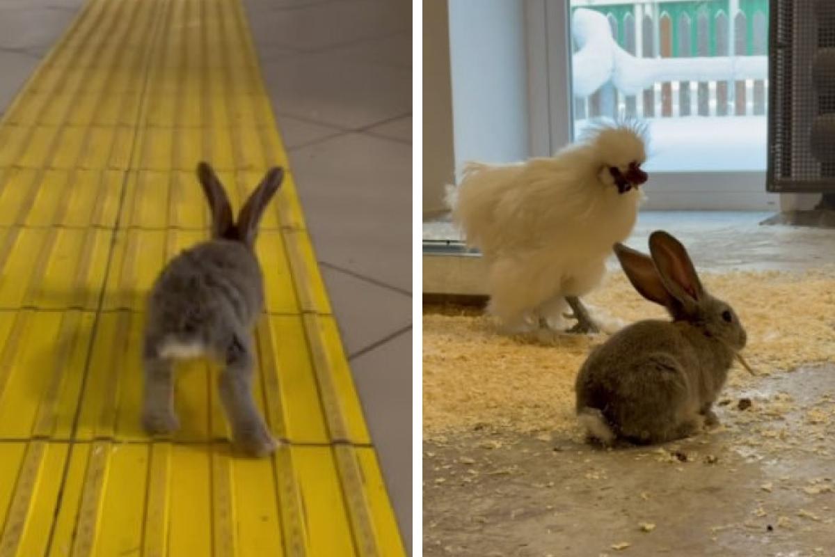 В Пермском зоопарке крольчонок Джонатан устроил прогулку по другим вольерам, навестив кур и козла.