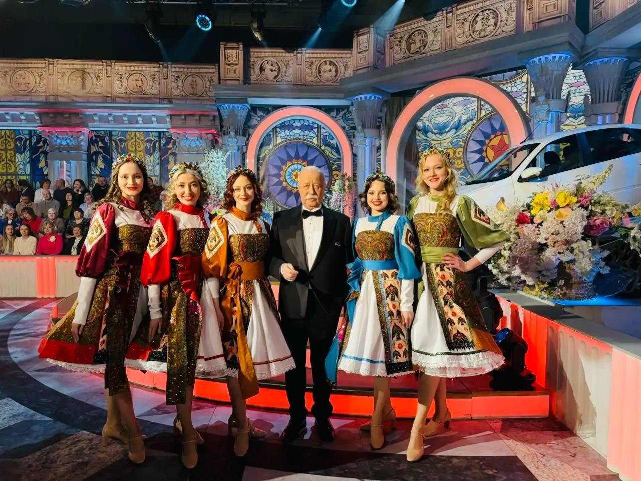 Фотография пермских артисток с бессменным ведущим Леонидом Якубовичем.