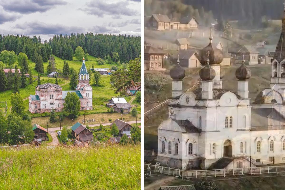 Слева представлена панорама поселка Кын, справа — Свято-Троицкая церковь, восстановленная в ИИ-ролике Елизаветы Синициной.