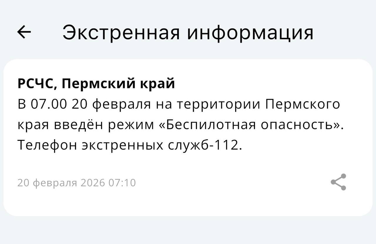 Режим беспилотной опасности, введённый в Пермском крае, начал действовать 20 февраля в 07:00 по местному времени. О данном решении жителей региона проинформировали через официальное приложение МЧС России.