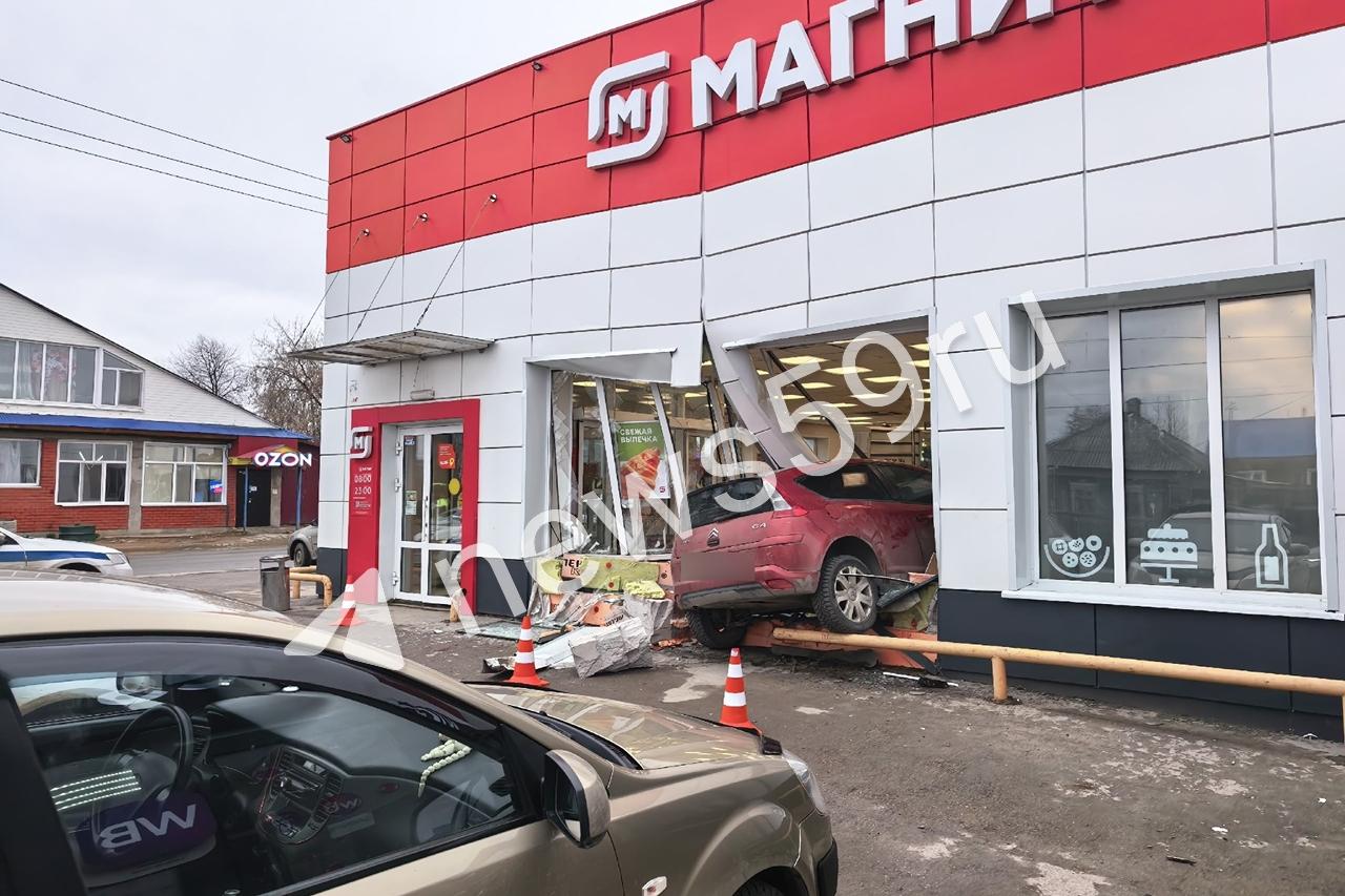 Автомобиль Citroen врезался в «Магнит» в Добрянке и застрял в окне