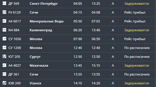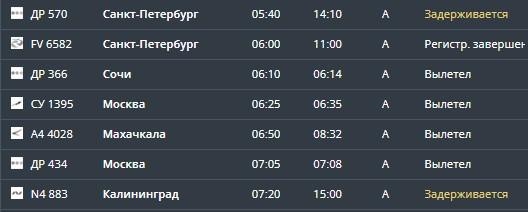 Утром задержаны вылеты двух самолетов. Рейс ДР 570 в Санкт-Петербург, запланированный на 05:40, перенесен на 14:10. Рейс N4 883 в Калининград вылетит не в 07:20, а в 15:00.