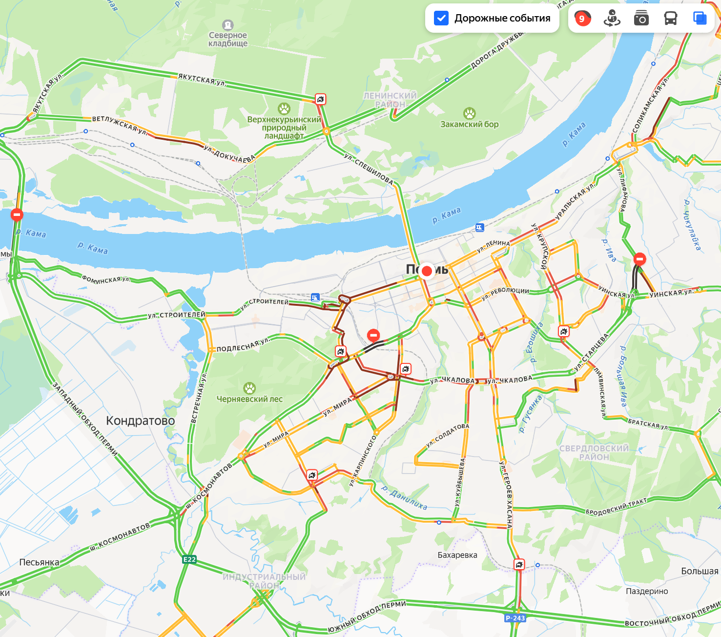 В 09:00 сервис «Яндекс Карты» оценил загруженность дорог Перми в 9 баллов из 10. По традиции сложное движение наблюдалось на Якутской перед кольцом в Сосновом бору, а также на улицах Чкалова, Соликамской, Грибоедова и Уинской.