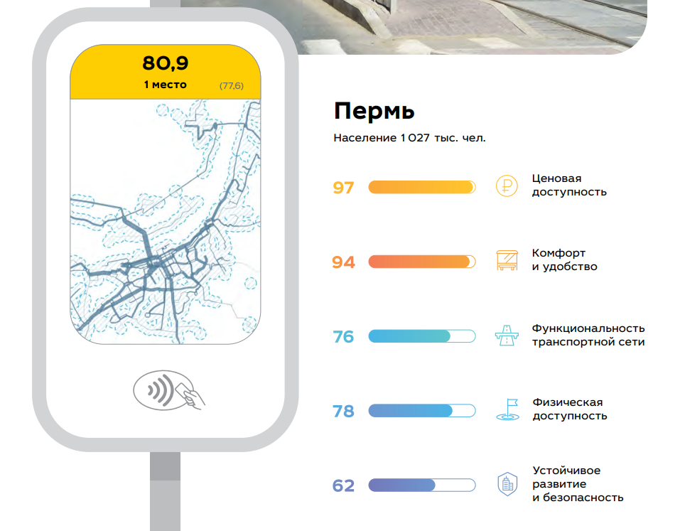 Пермь удерживает лидирующую позицию третий год подряд, получив 97 баллов из 100 за ценовую доступность и 94 балла за удобство. Второе место занял Екатеринбург, третье — Новокузнецк, четвёртое и пятое — Нижний Новгород и Казань.