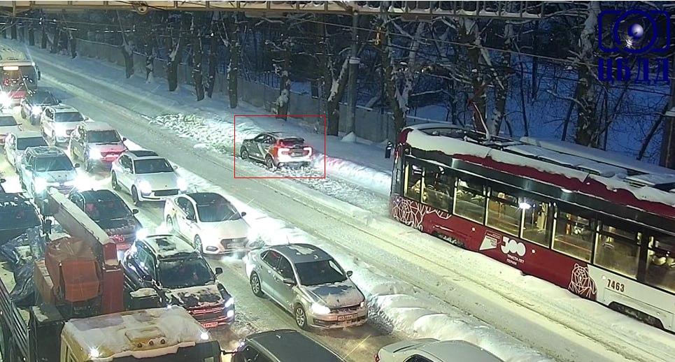В Telegram-канале ЦБДД Пермского края опубликовали скриншот с камеры наблюдения на Революции между кольцом у Колхозной площади и перекрестком с улицей Куйбышева. Движение на этом отрезке разрешено только в сторону Куйбышева. Водитель легковушки попытался объехать запрет, направившись к кольцу по трамвайным путям, где машина увязла в снегу.