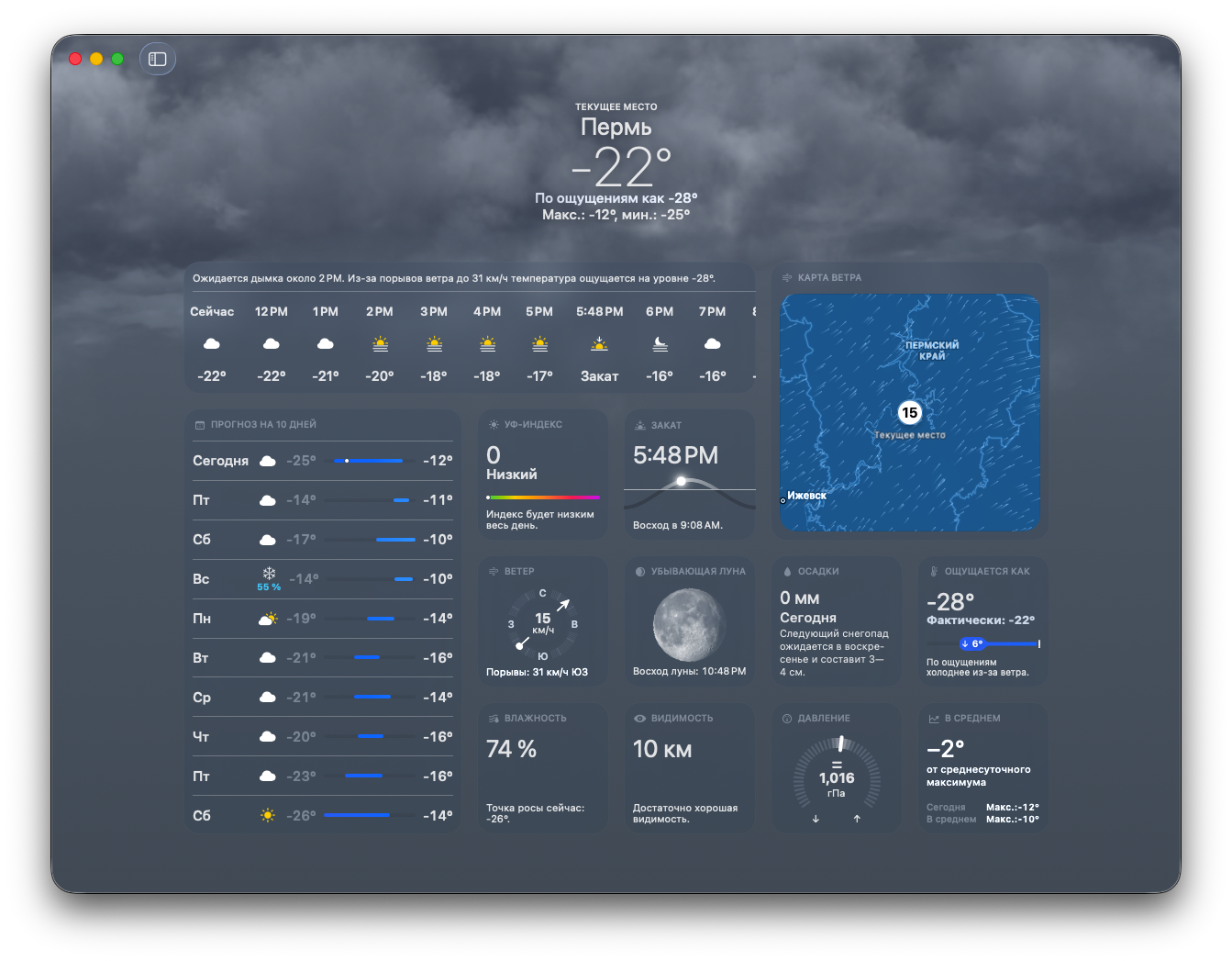 Показания ощущаемой температуры варьируются в зависимости от сервиса; так, в приложении «Погода» отображается значение -28°C.